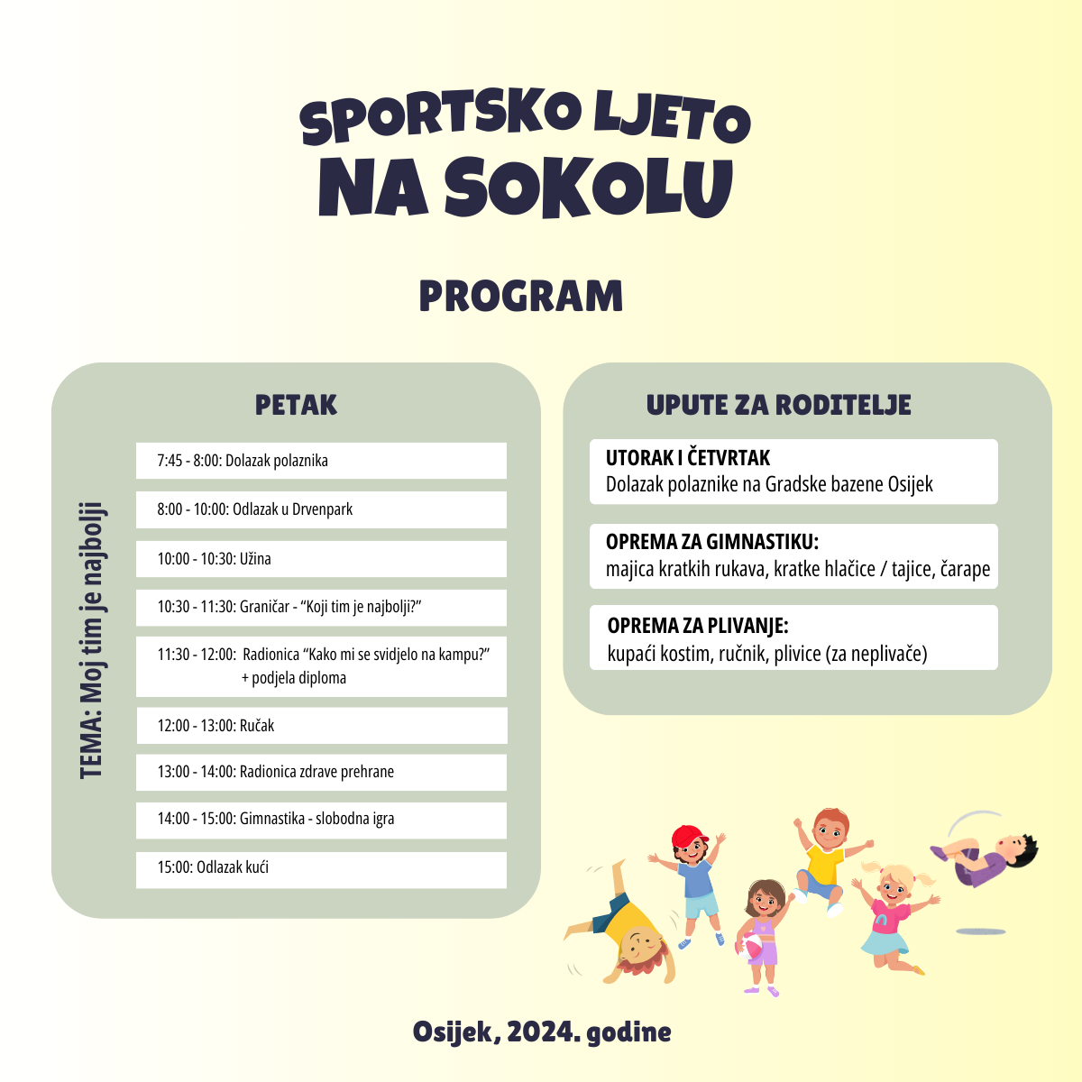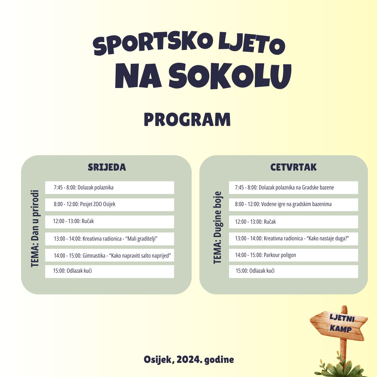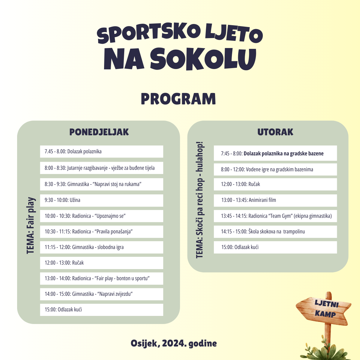 Sportsko ljeto na Sokolu_powered by Zagrebačka banka ljetni je kamp namijenjen djeci od 5 do 12 godina, a provodi se kroz petodnevni boravak u vrhunskom sportsko – rekreacijskom objektu Sokol Centar Osijek (Kralja Zvonimira 5 u Osijeku).